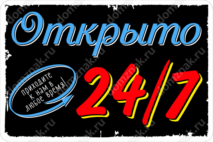 Табличка «Открыто 24/7 приходите к нам в любое время»